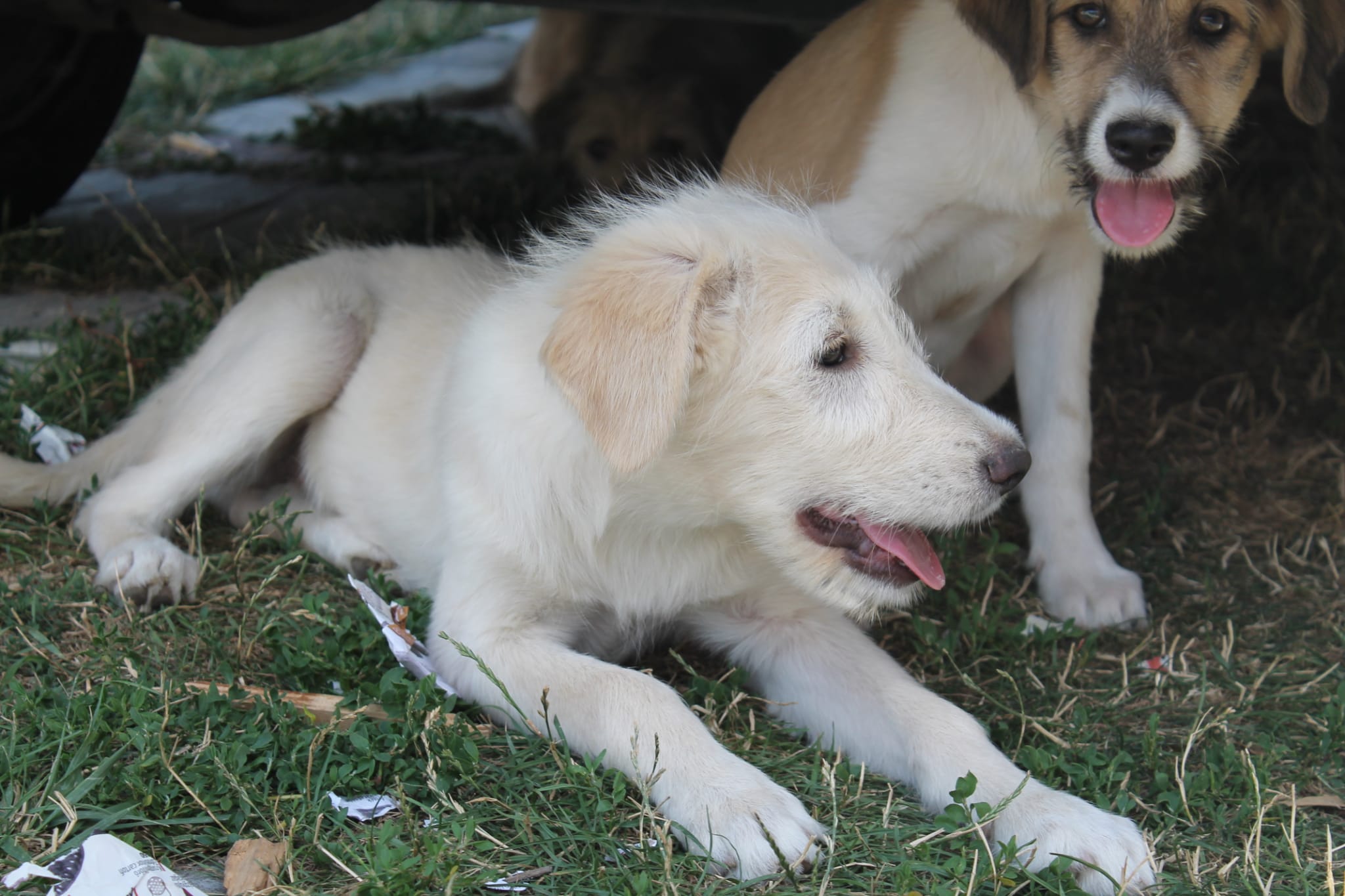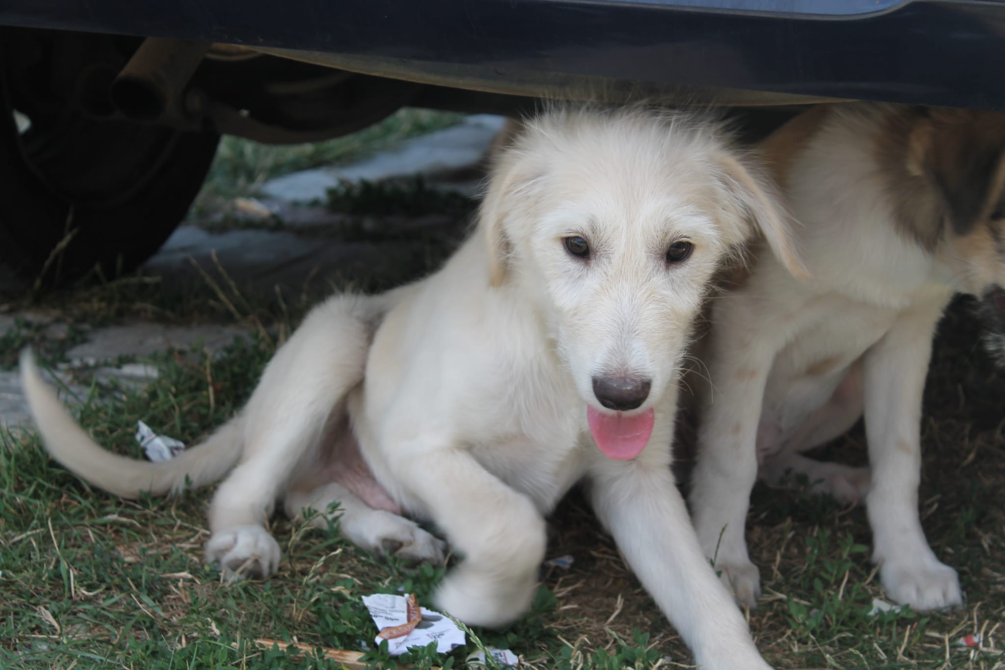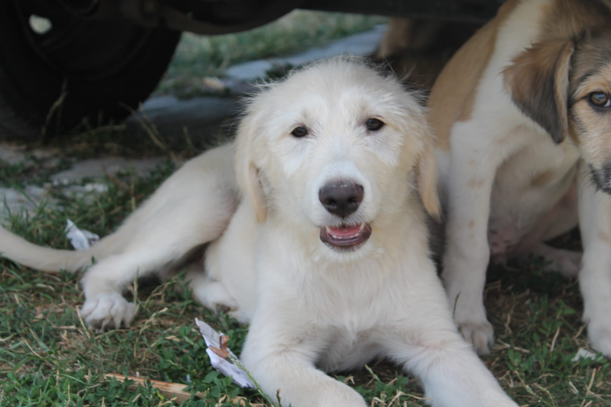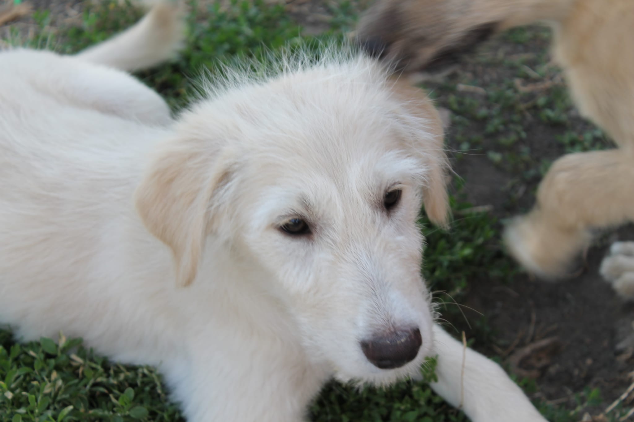 La mère de Nakos, Nina a été trouvée attachée à une corde. Elle avait été traînée du bord de la route jusqu’au milieu d’un fossé. Elle était tellement maigre, affamée et déshydratée qu’elle n’avait pas assez de lait pour ses chiots.