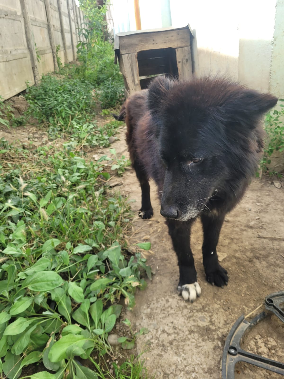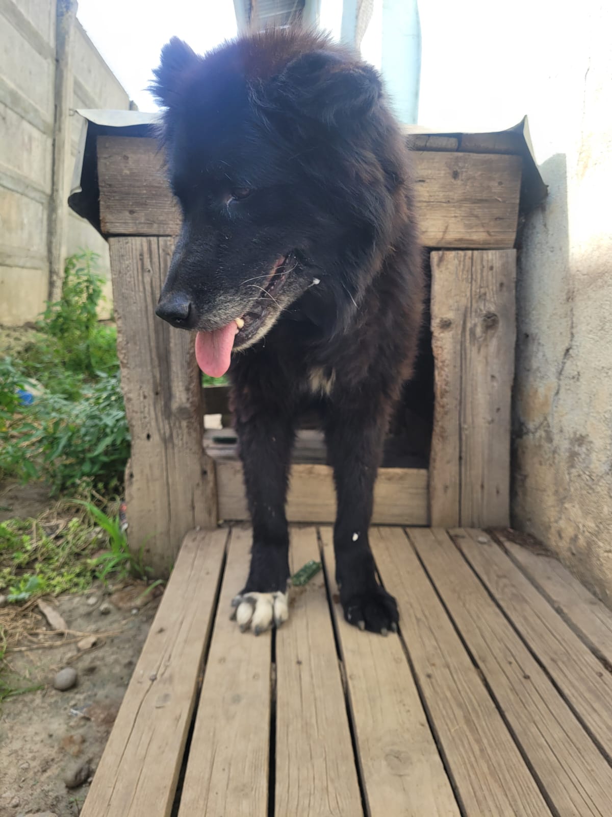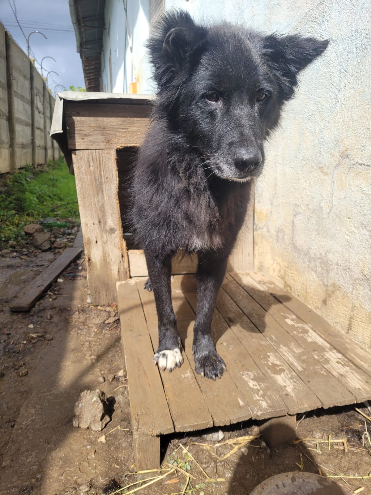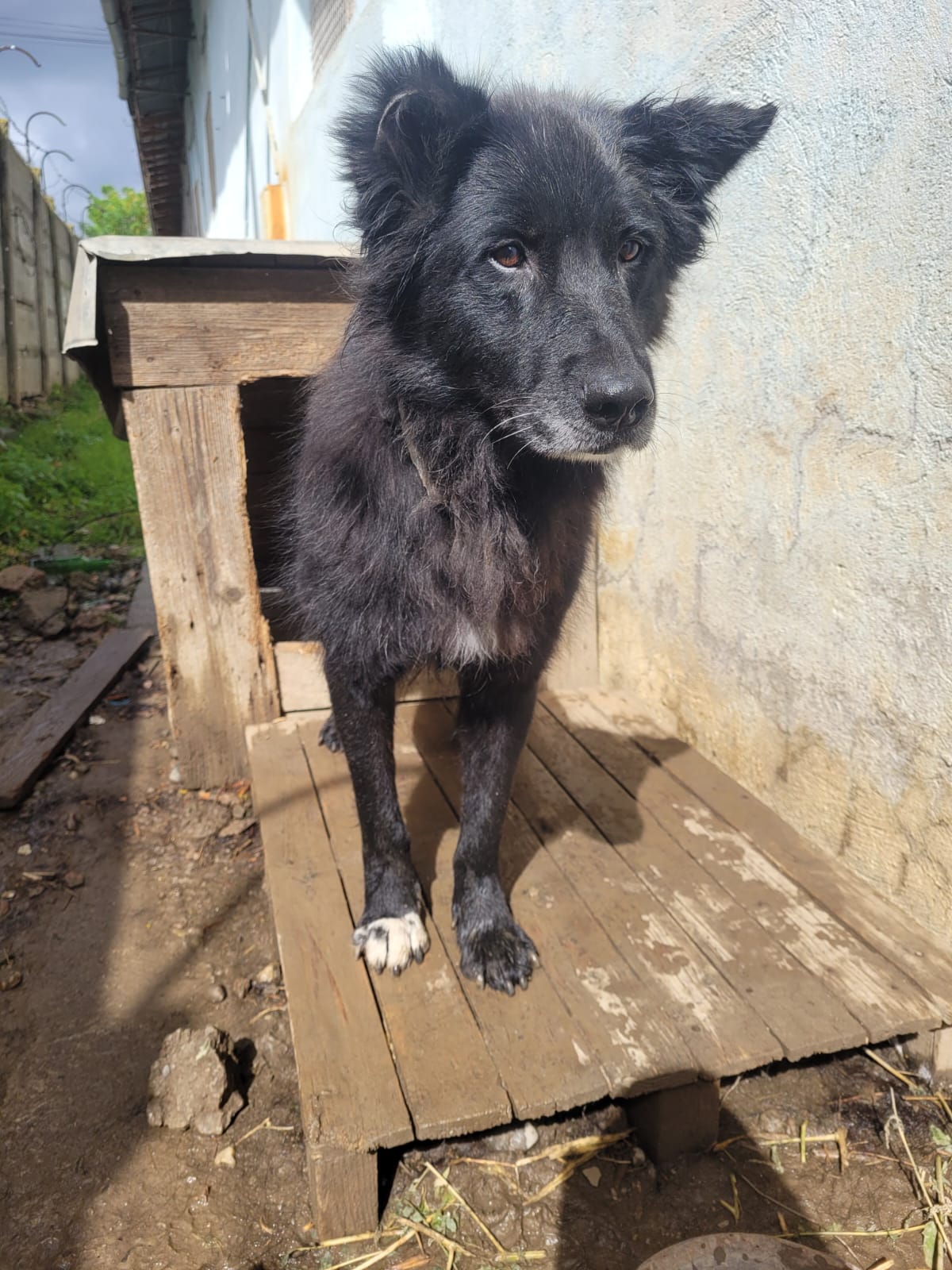 Elle est actuellement dans un chenil en extérieur. Elle est incontinente, et une de ses oreilles a été coupée… Il est aujourd’hui temps qu’elle puisse profiter de ses derniers instants. Elle n’en veut pas pour autant à l’humain, elle est toujours heureuse de voir un bipède, et lui fait la fête. Elle est proche des humains.