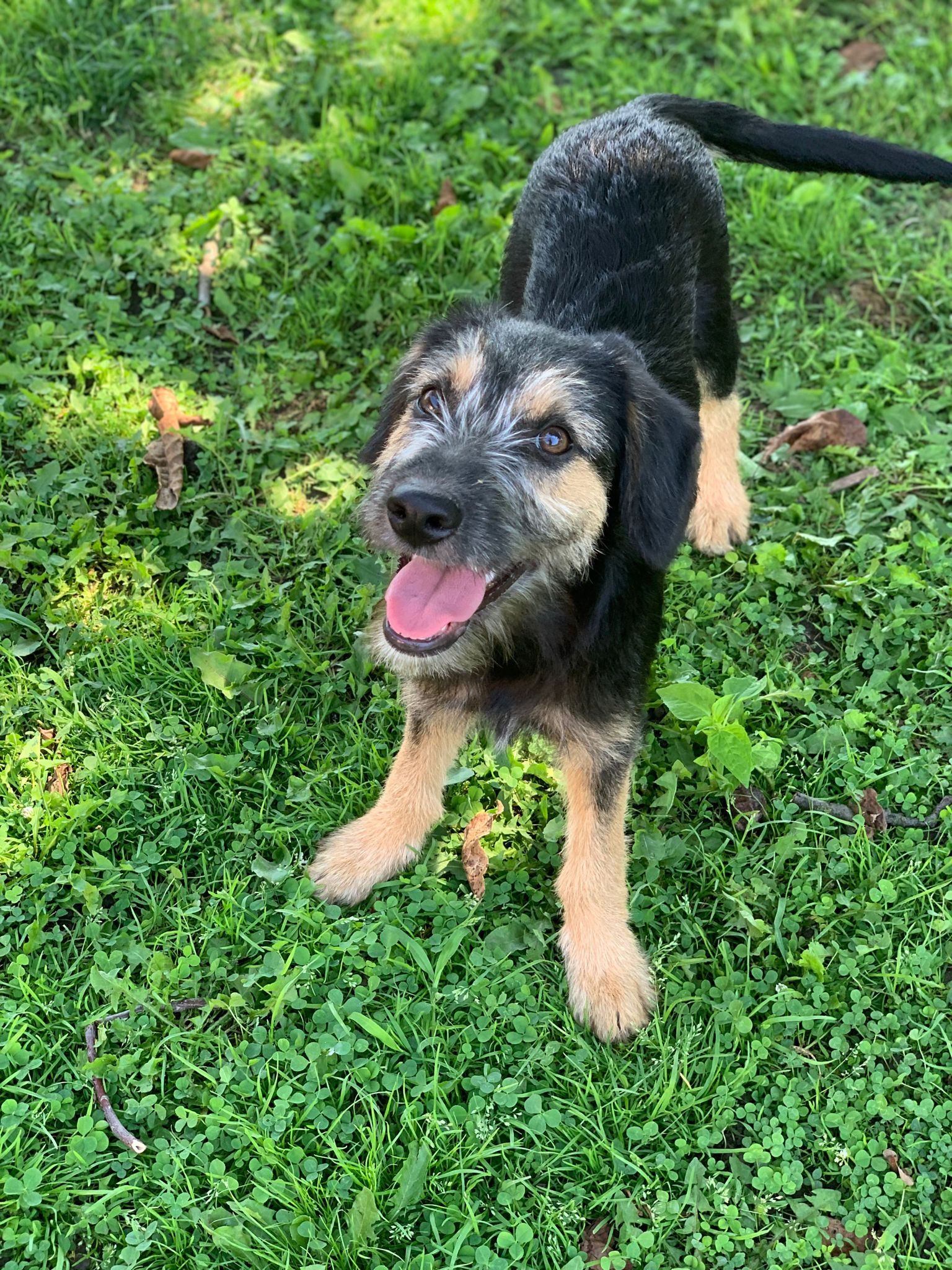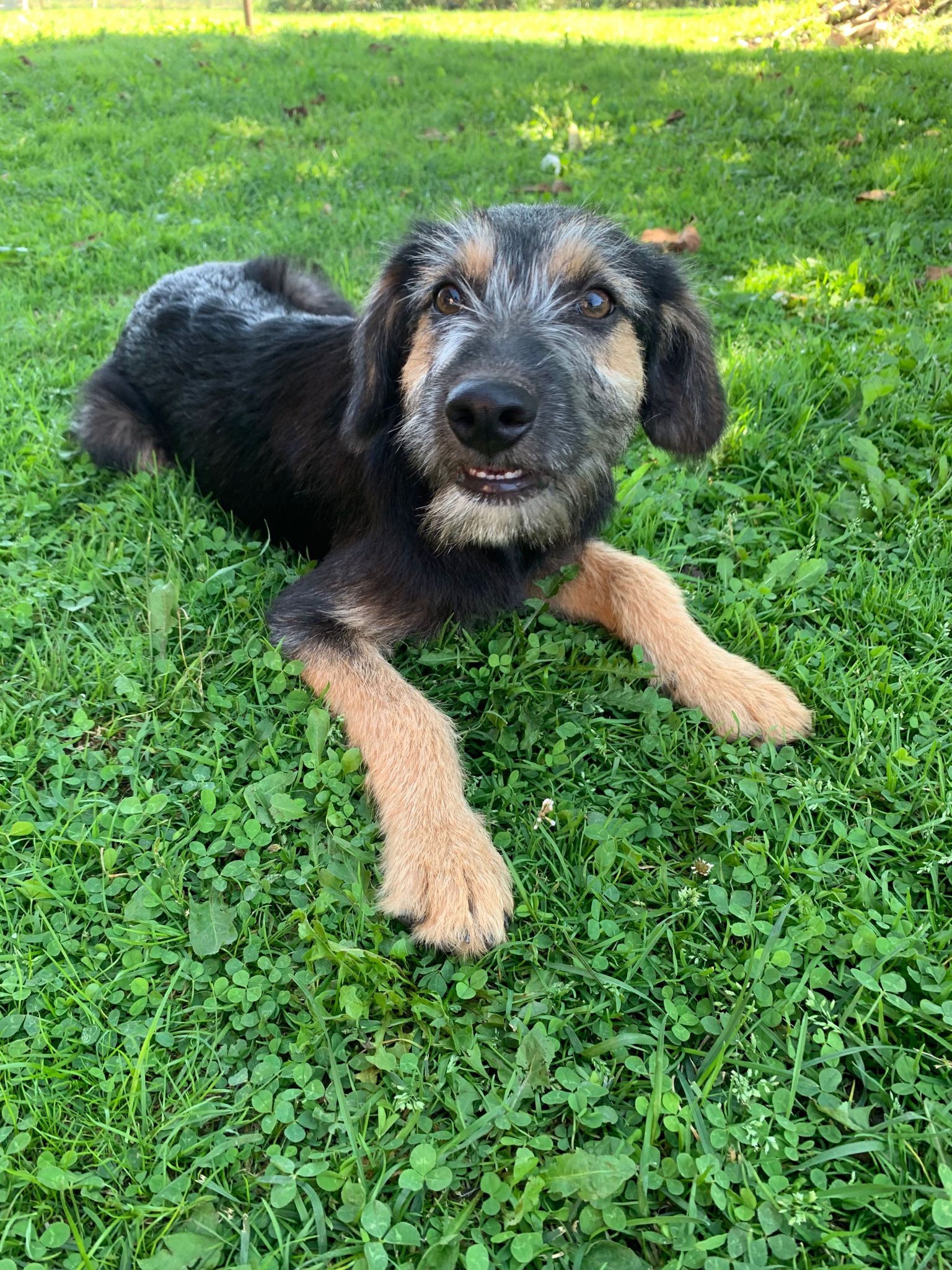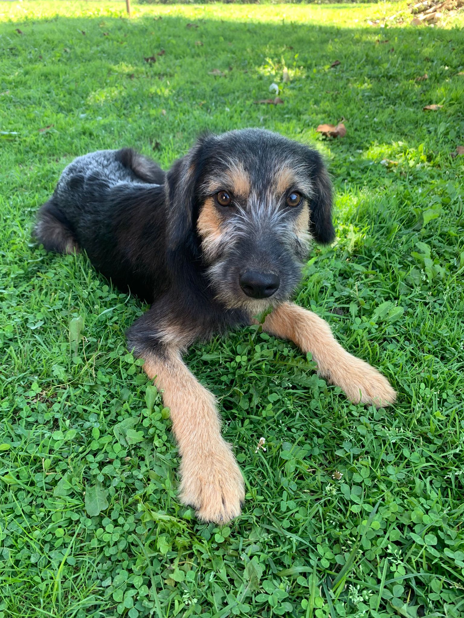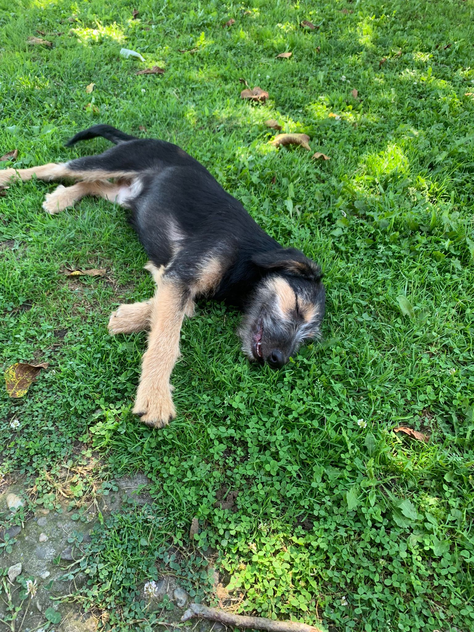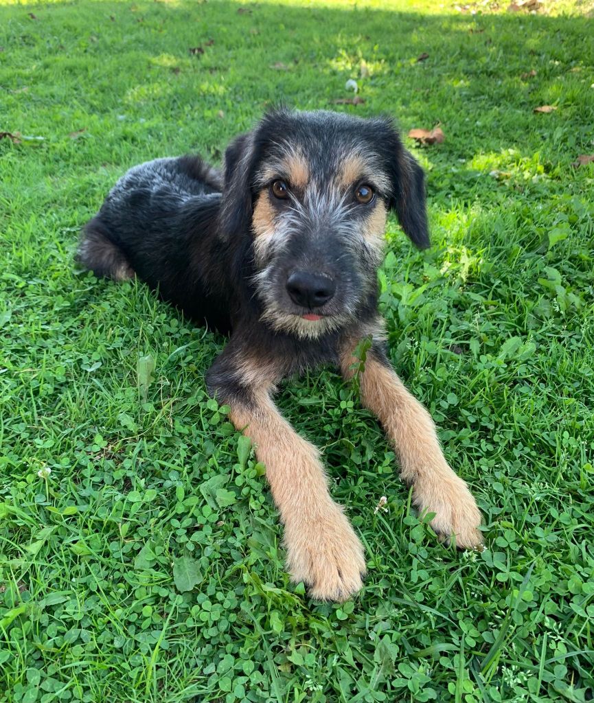 Letty nous est venue d’un camp gitan, nous avons réussi à les convaincre de nous laisser stériliser sa maman. Ils voulaient garder sa maman, qui est un chien de taille moyenne, de père inconnu. Letty pèse à 4 mois 8 kg, elle sera probablement une chienne de taille moyenne.