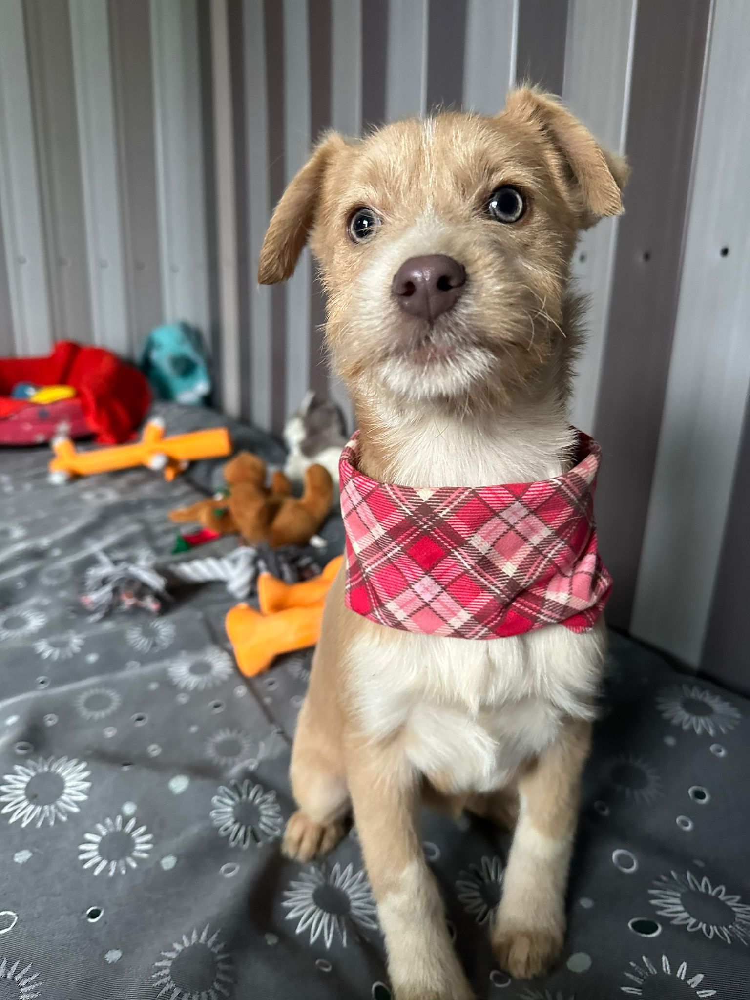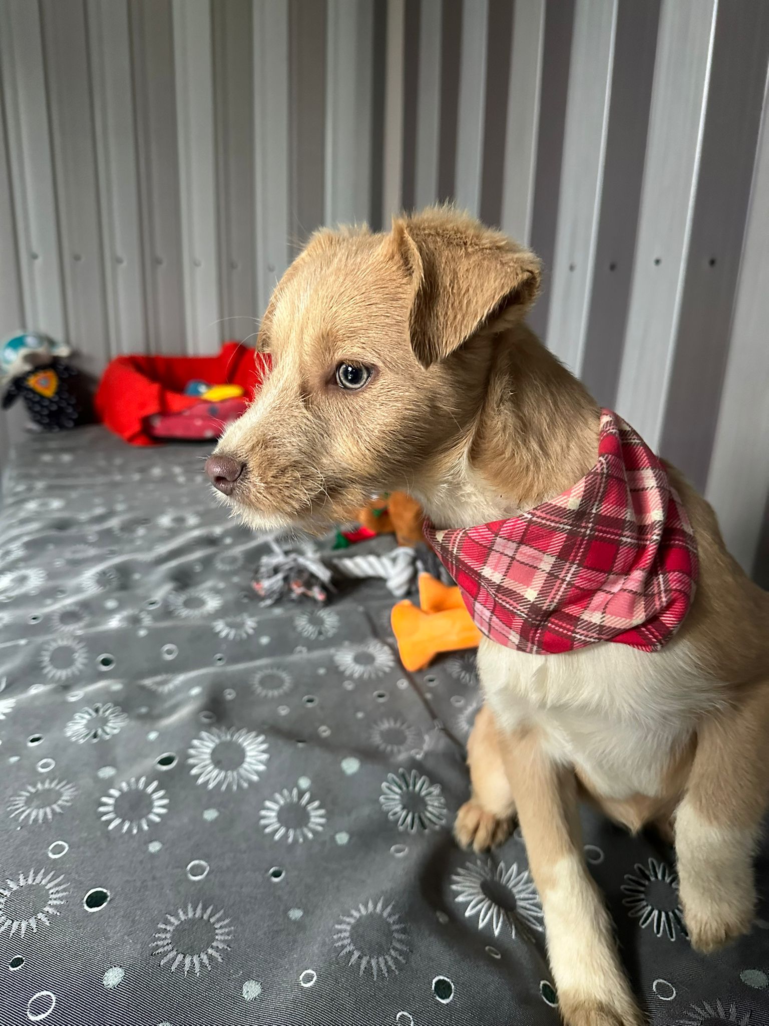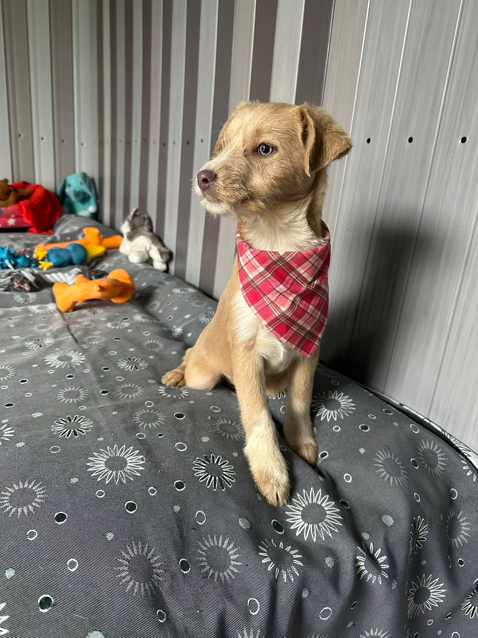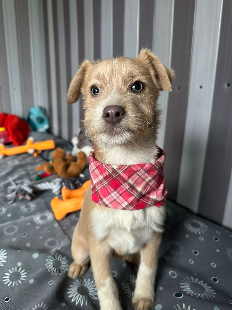 Elle est la plus petite chienne de la portée, délicate mais tout aussi courageuse. En tant que benjamine, elle est souvent submergée par le jeu animé de ses frères et sœurs, mais elle conserve une grâce et une beauté uniques. Elle apprécie particulièrement la compagnie des humains et se plaît à être caressée. Être en sécurité dans les bras d’une personne est son refuge préféré. Curieuse, elle recherche avec enthousiasme l’attention et les caresses. Elle s’entend bien avec les chiens, chats et enfants.