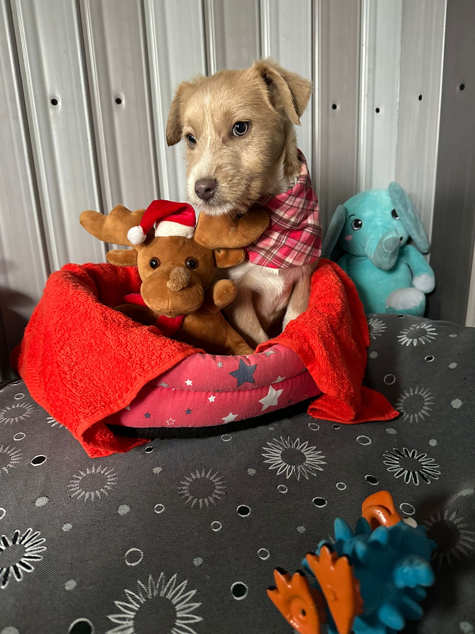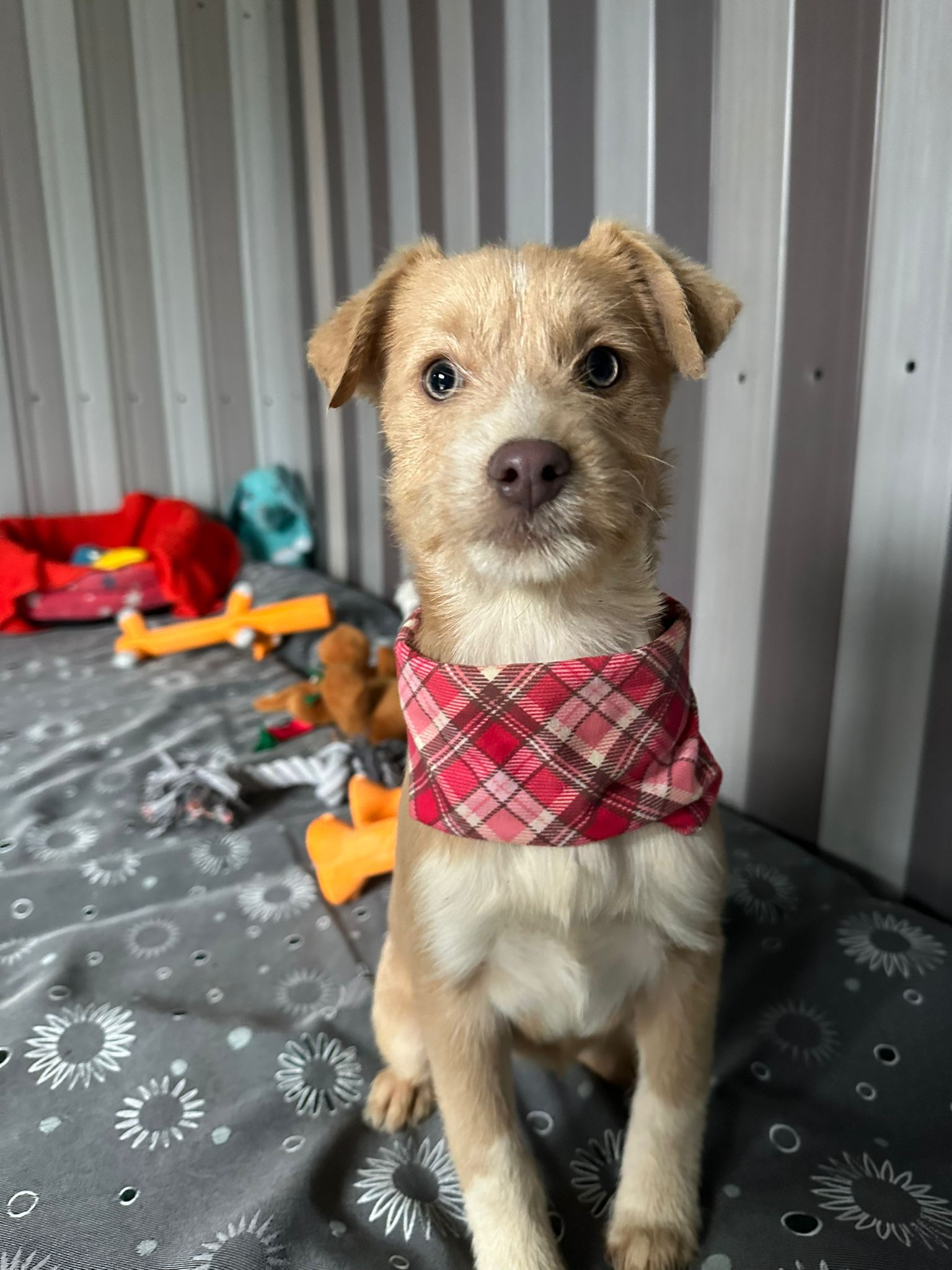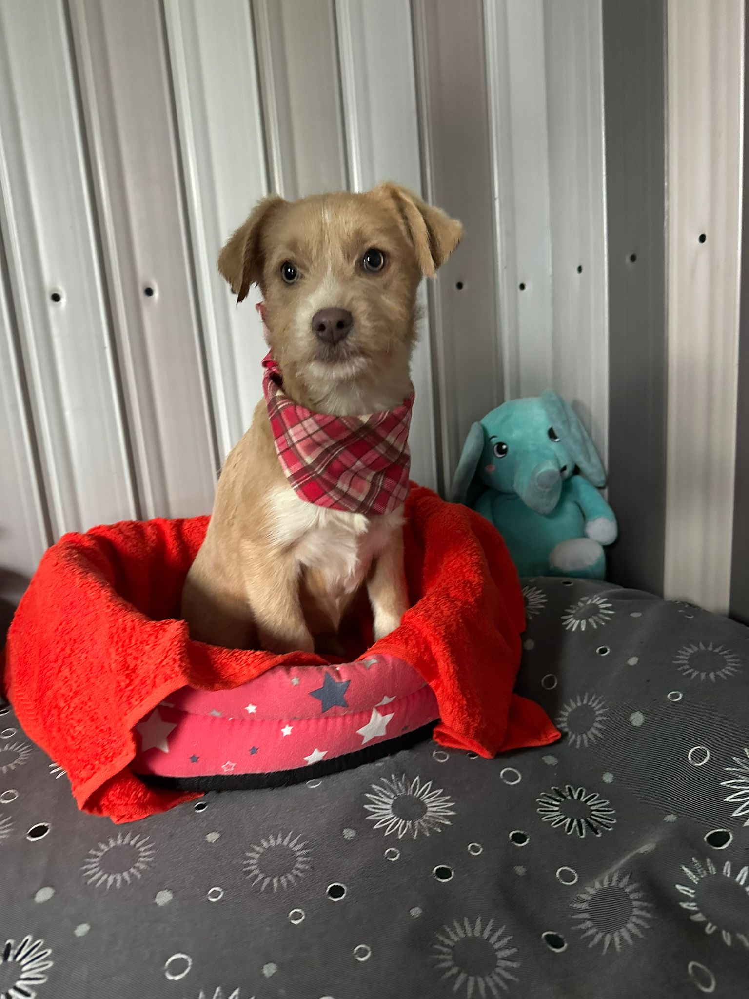 Elle est la plus petite chienne de la portée, délicate mais tout aussi courageuse. En tant que benjamine, elle est souvent submergée par le jeu animé de ses frères et sœurs, mais elle conserve une grâce et une beauté uniques. Elle apprécie particulièrement la compagnie des humains et se plaît à être caressée. Être en sécurité dans les bras d’une personne est son refuge préféré. Curieuse, elle recherche avec enthousiasme l’attention et les caresses. Elle s’entend bien avec les chiens, chats et enfants.