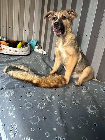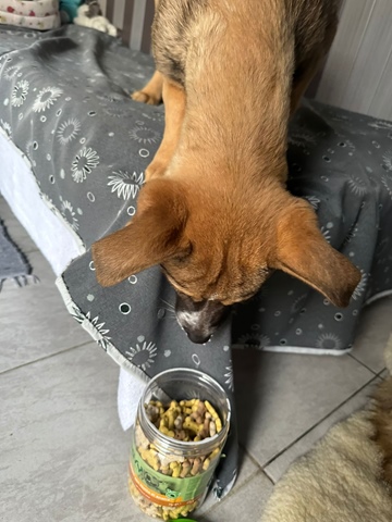 Jolie a donné naissance à Jonna et à ses frères et sœurs dans un endroit où ils n’étaient pas en sécurité. Nos partenaires ont réussi à tous les récupérer, malheureusement la mère a été percutée par une voiture entre-temps. Elle va bien aujourd’hui, elle attend également sa famille pour la vie.