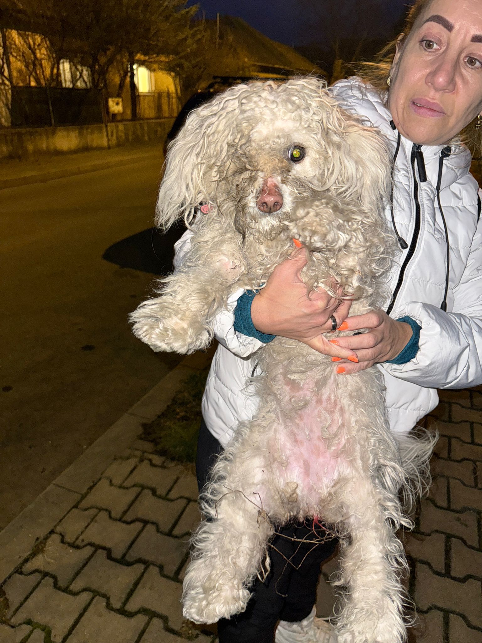Nous avons été contactés par la famille qui possède sa maman, ils nous ont informés qu’ils avaient donnée Leila à l’adoption lorsqu’elle avait 5-6 mois. En allant la voir, ils ont découvert que Leila était gardée dehors dans des conditions déplorables. Ils l’ont donc récupérée de ses adoptants et ont sollicité notre aide, car ils ne peuvent pas la garder eux-mêmes. Elle sera splendide une fois que ses poils auront repoussé.