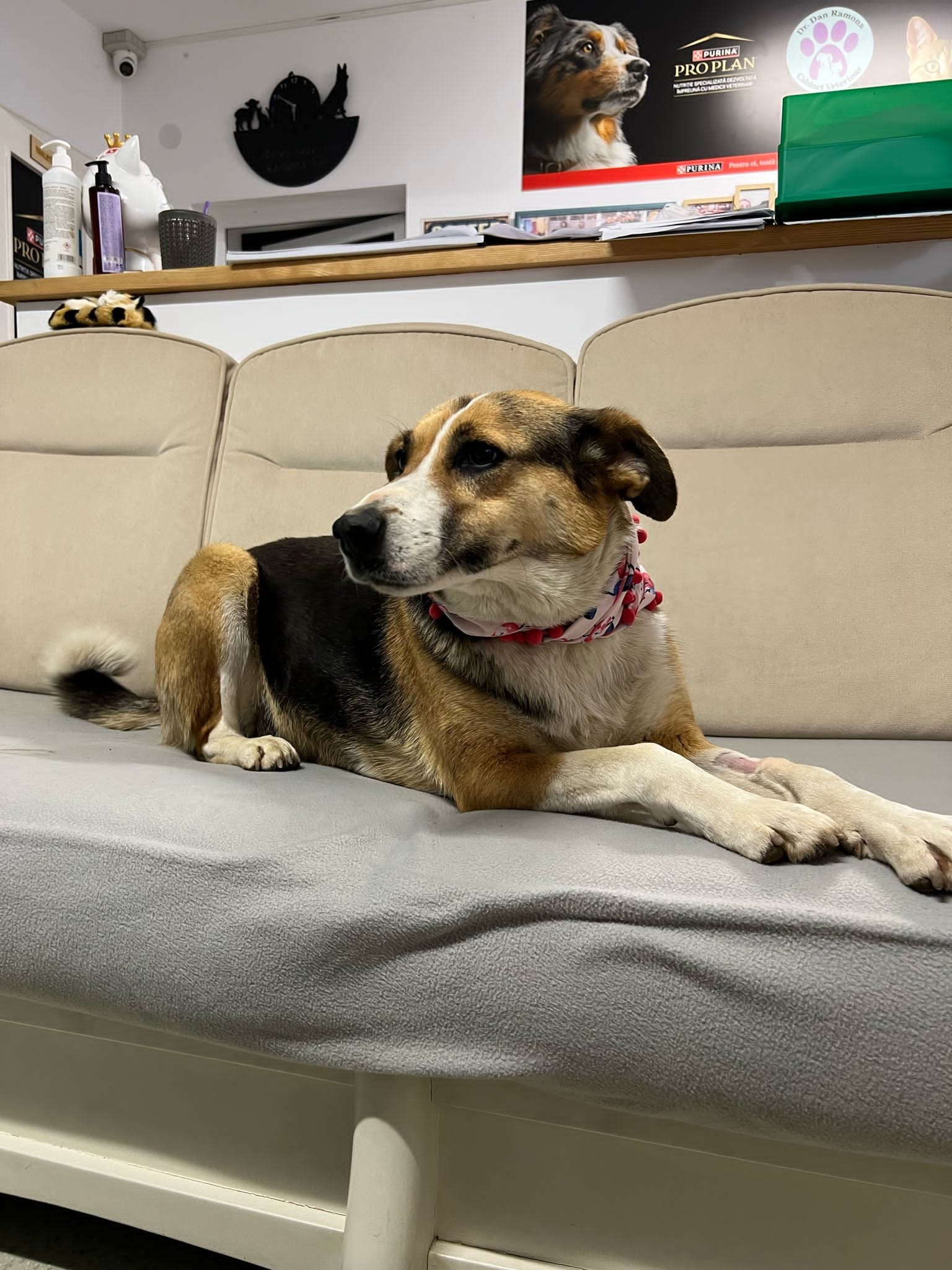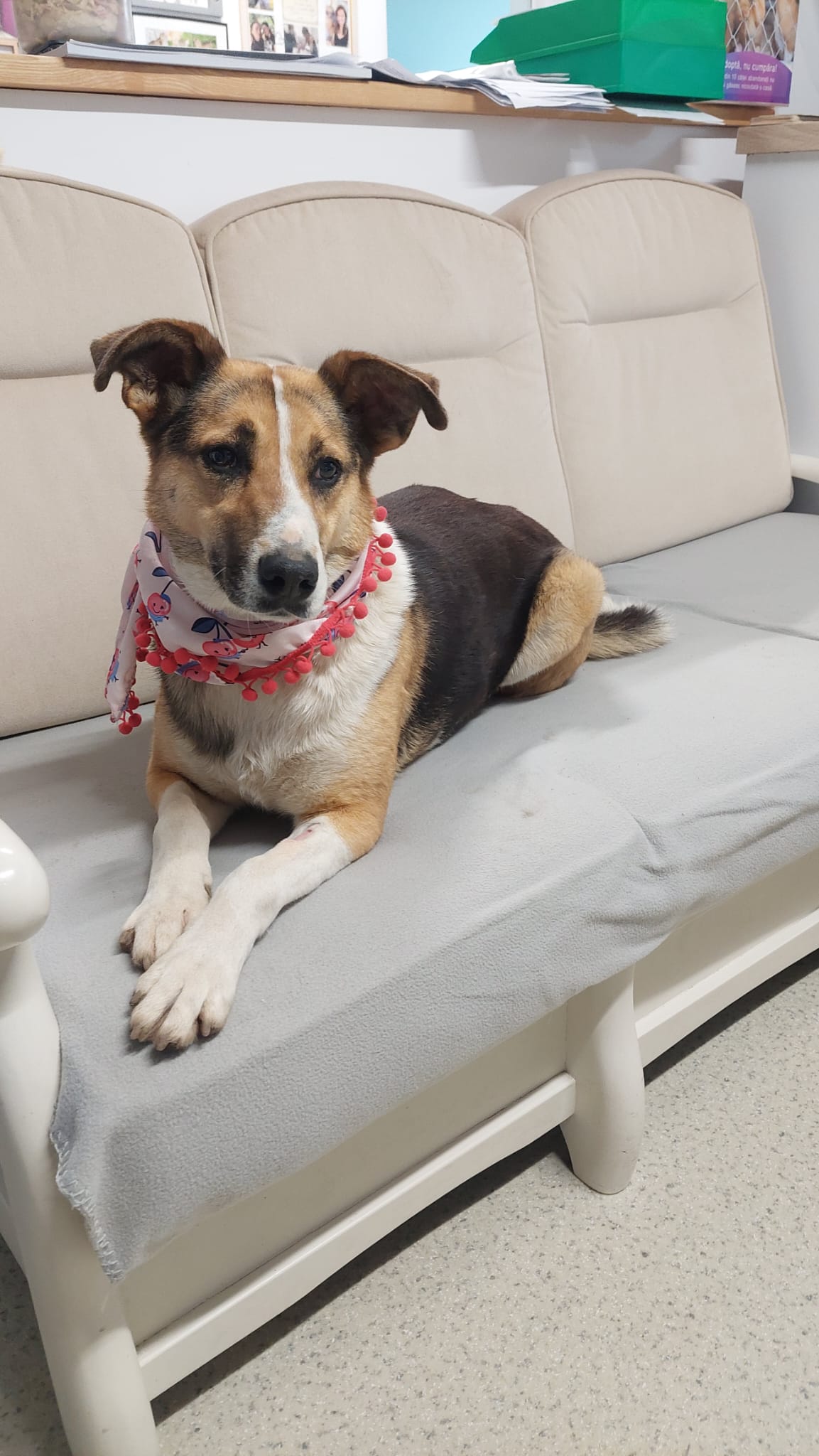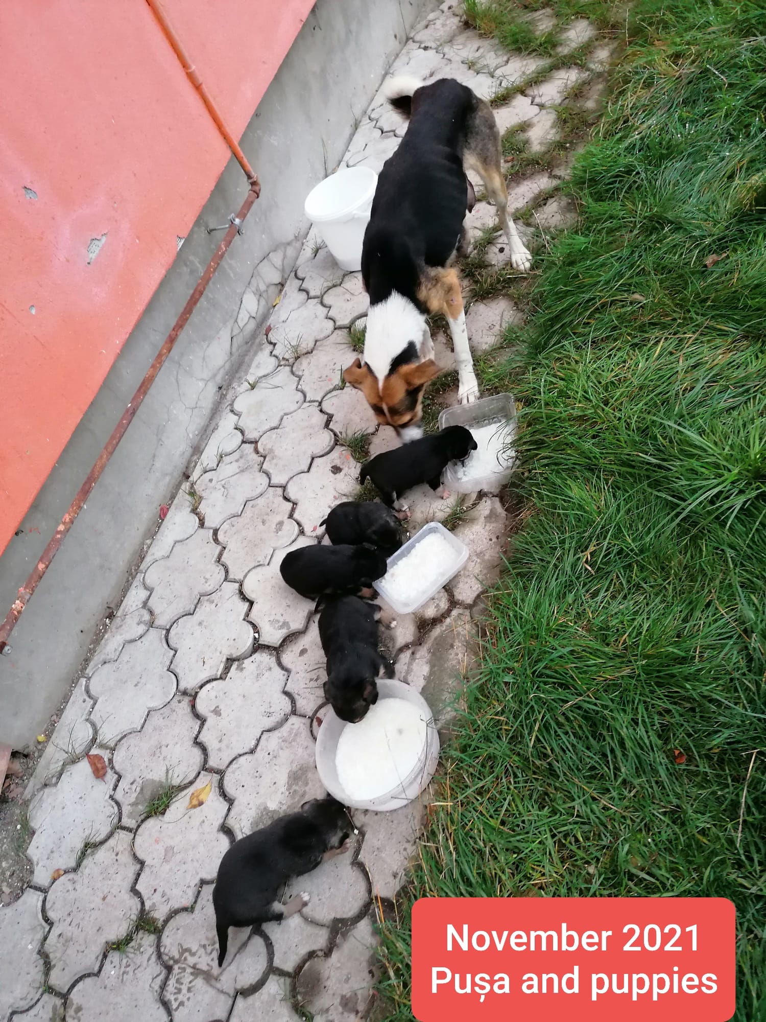 En novembre 2021, Pușa a été prise en charge lors d’une campagne de stérilisation. Les forces de l’ordre l’ont trouvée dans une communauté marginalisée, vivant dans un sous-sol sombre et froid avec ses cinq chiots nouveau-nés. Amaigrie et en état de malnutrition sévère, elle n’avait presque pas de lait pour ses petits. Après sa stérilisation, elle a même mangé son alaise, témoignant l’extrême gravité de sa condition.