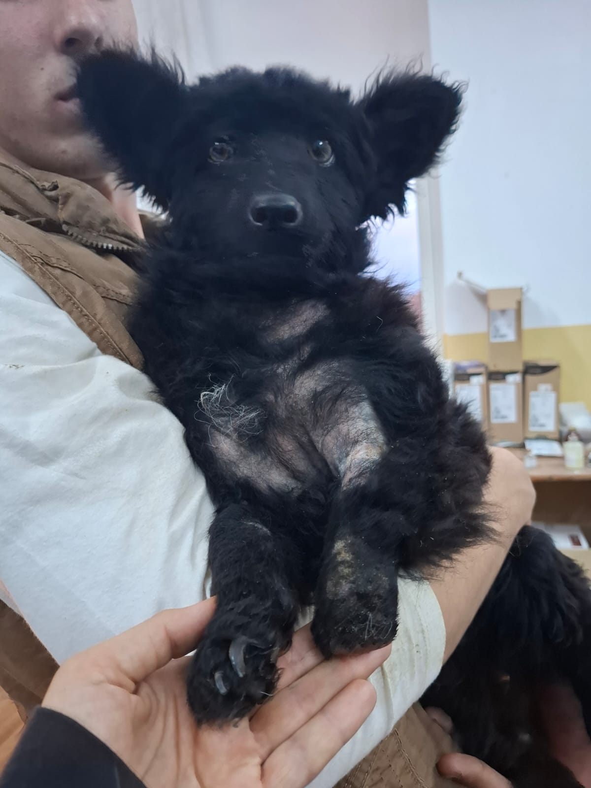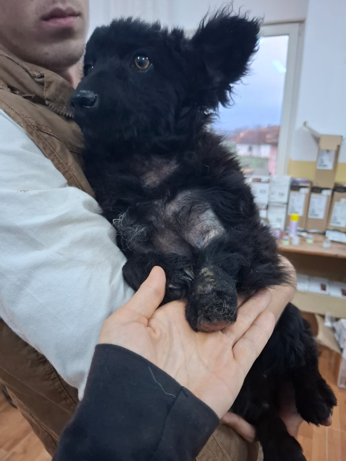 Alegra a été retrouvée dans les bois, près d’une voie ferrée, probablement percutée par un train. Elle avait perdu une partie de sa patte avant gauche et souffrait aussi de la droite. Les vétérinaires ont tenté de sauver sa patte, mais elle s’infectait à cause de la manière dont elle s’appuyait dessus pour marcher. L’amputation était inévitable.