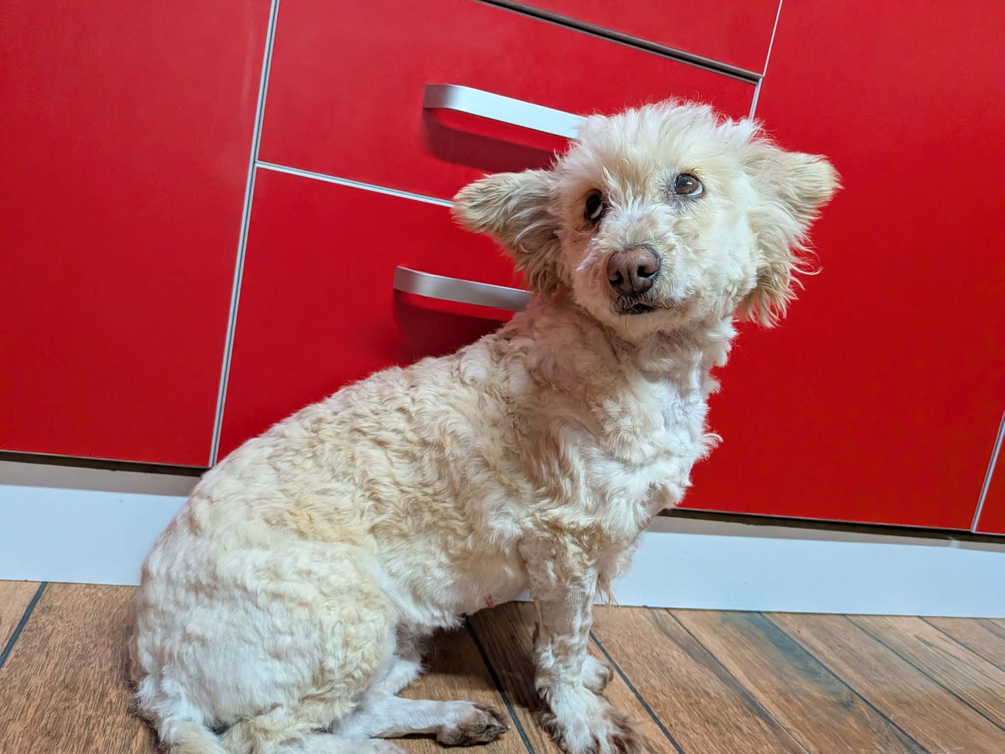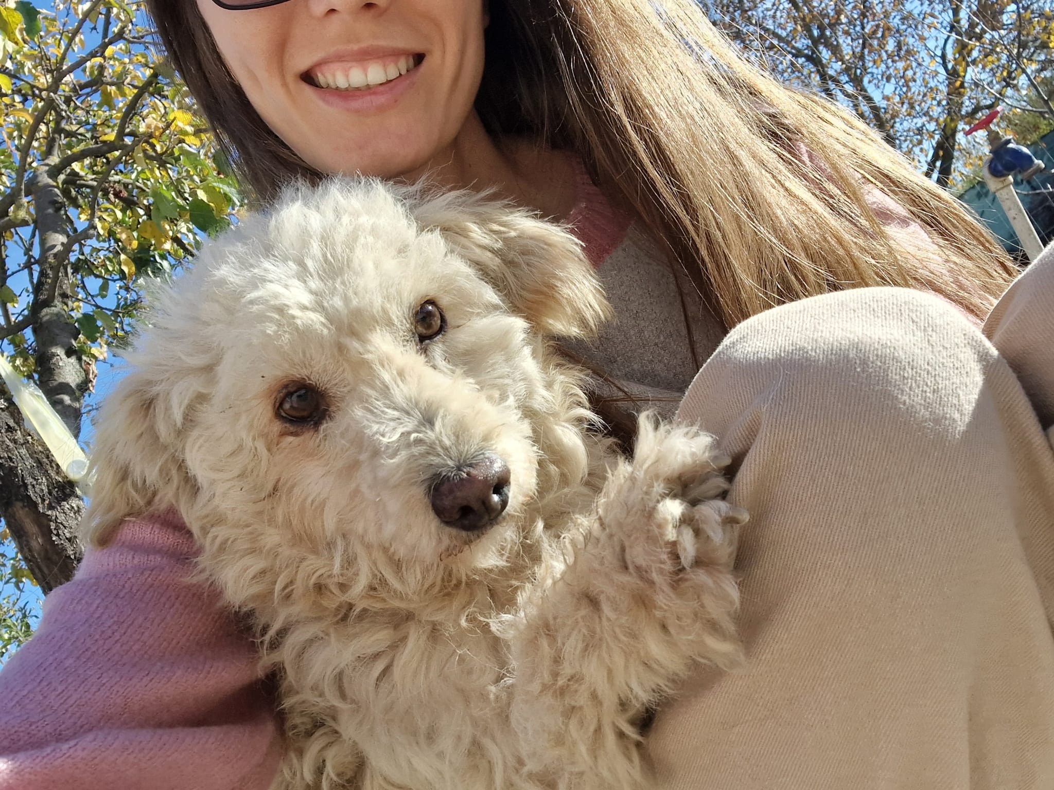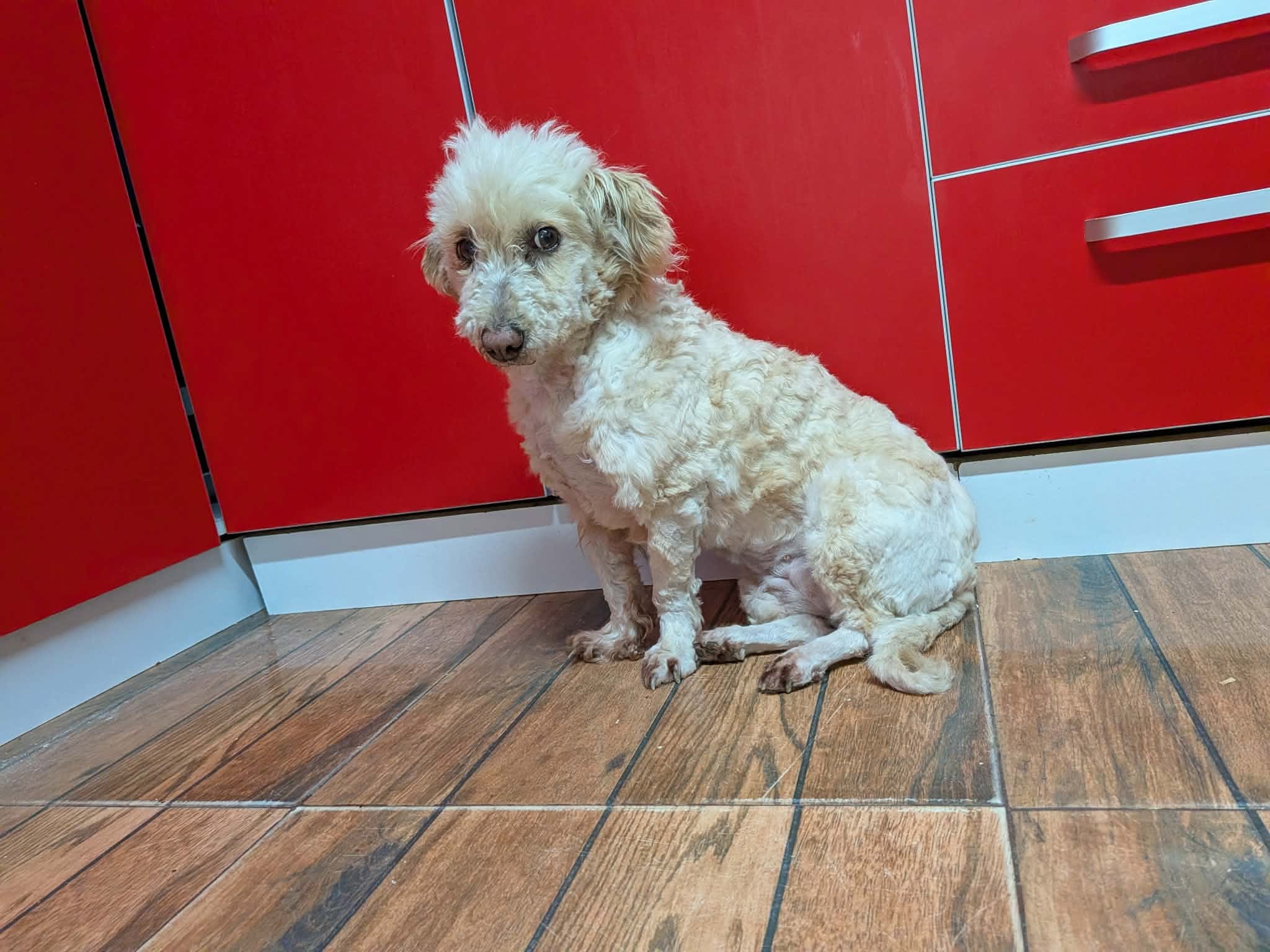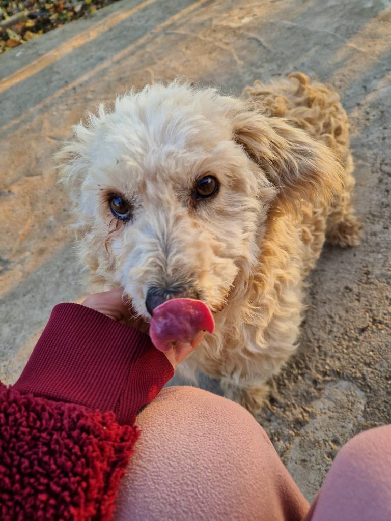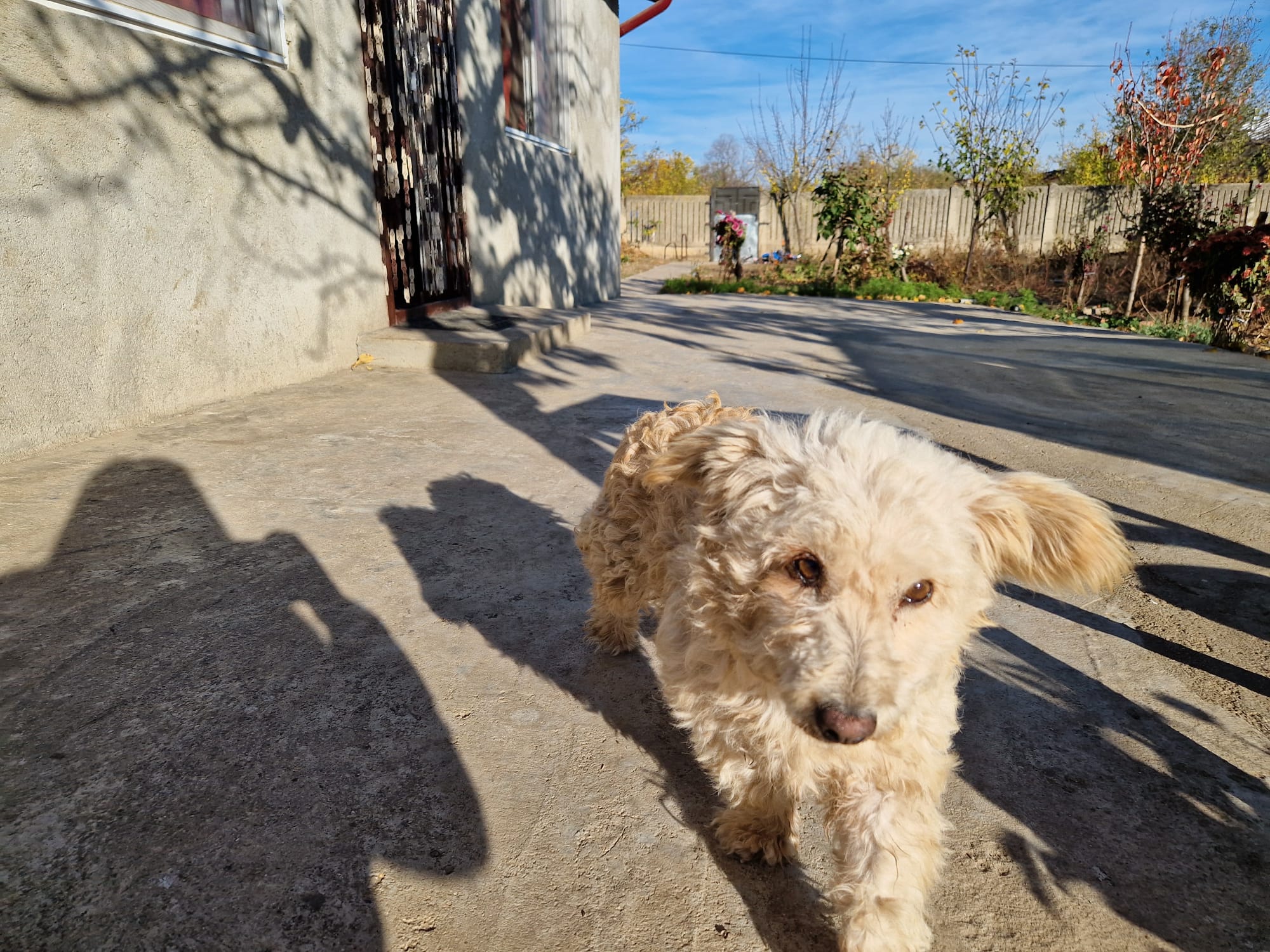 Thalia a été trouvée seule dans un champ. Son poil était très long, sale, emmêlé et plein de débris, ce qui laisse penser qu’elle errait depuis un bon moment. Une famille roumaine l’a recueillie, lui a donné un bon bain et l’a toilettée.
