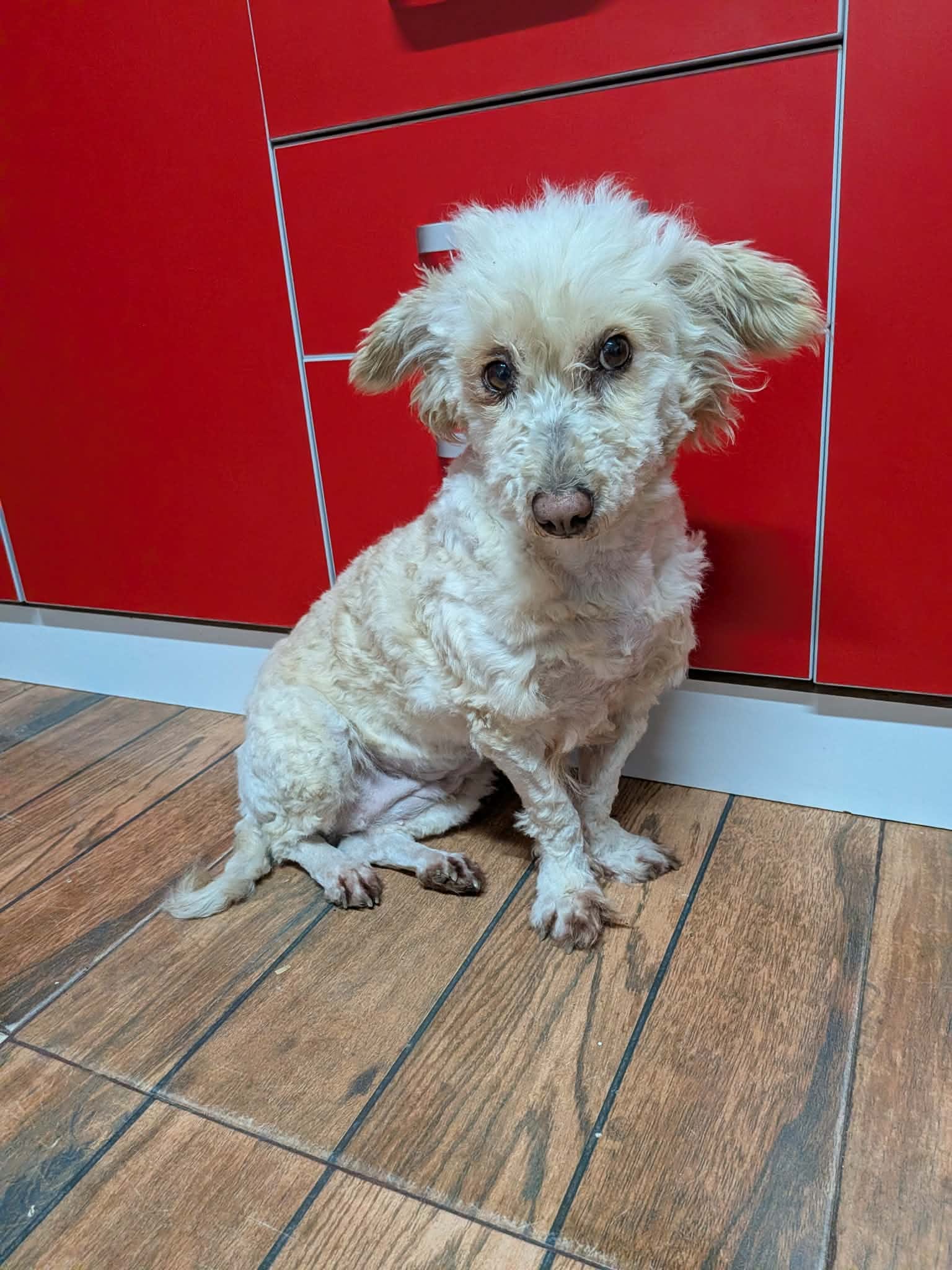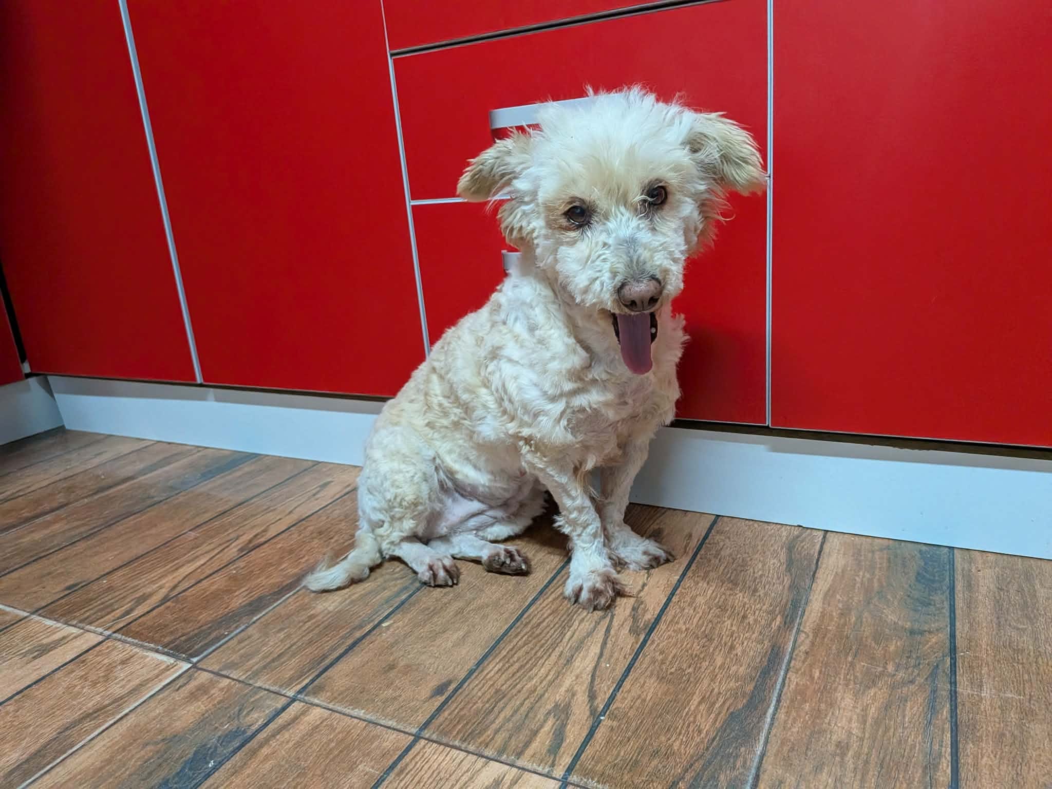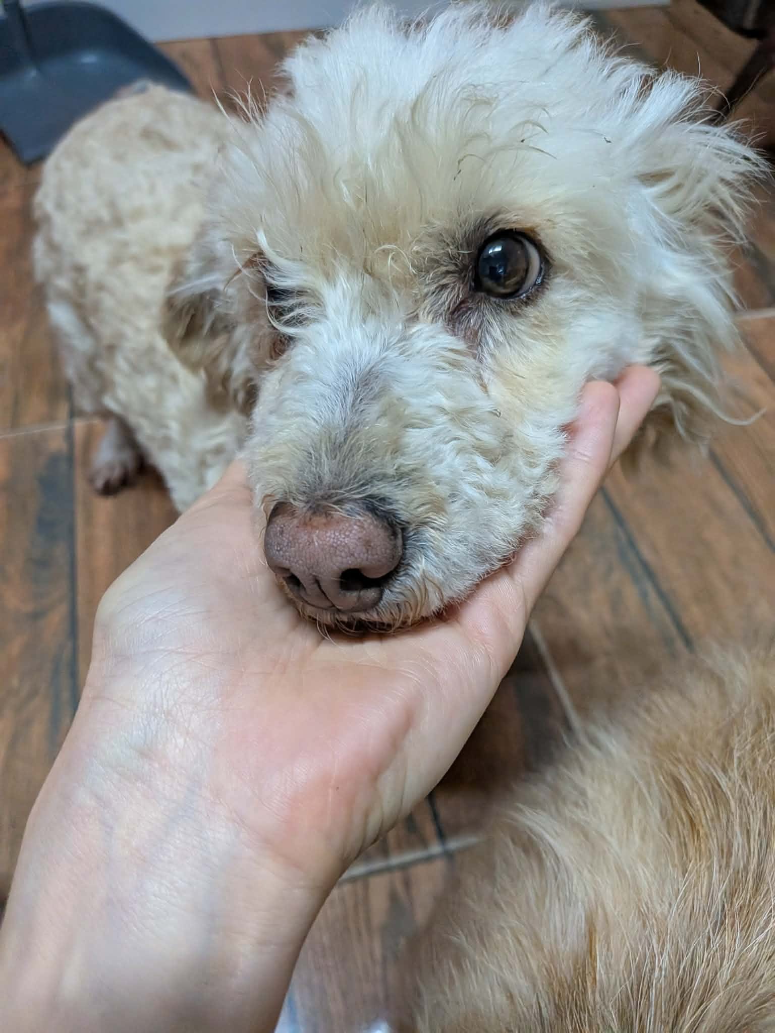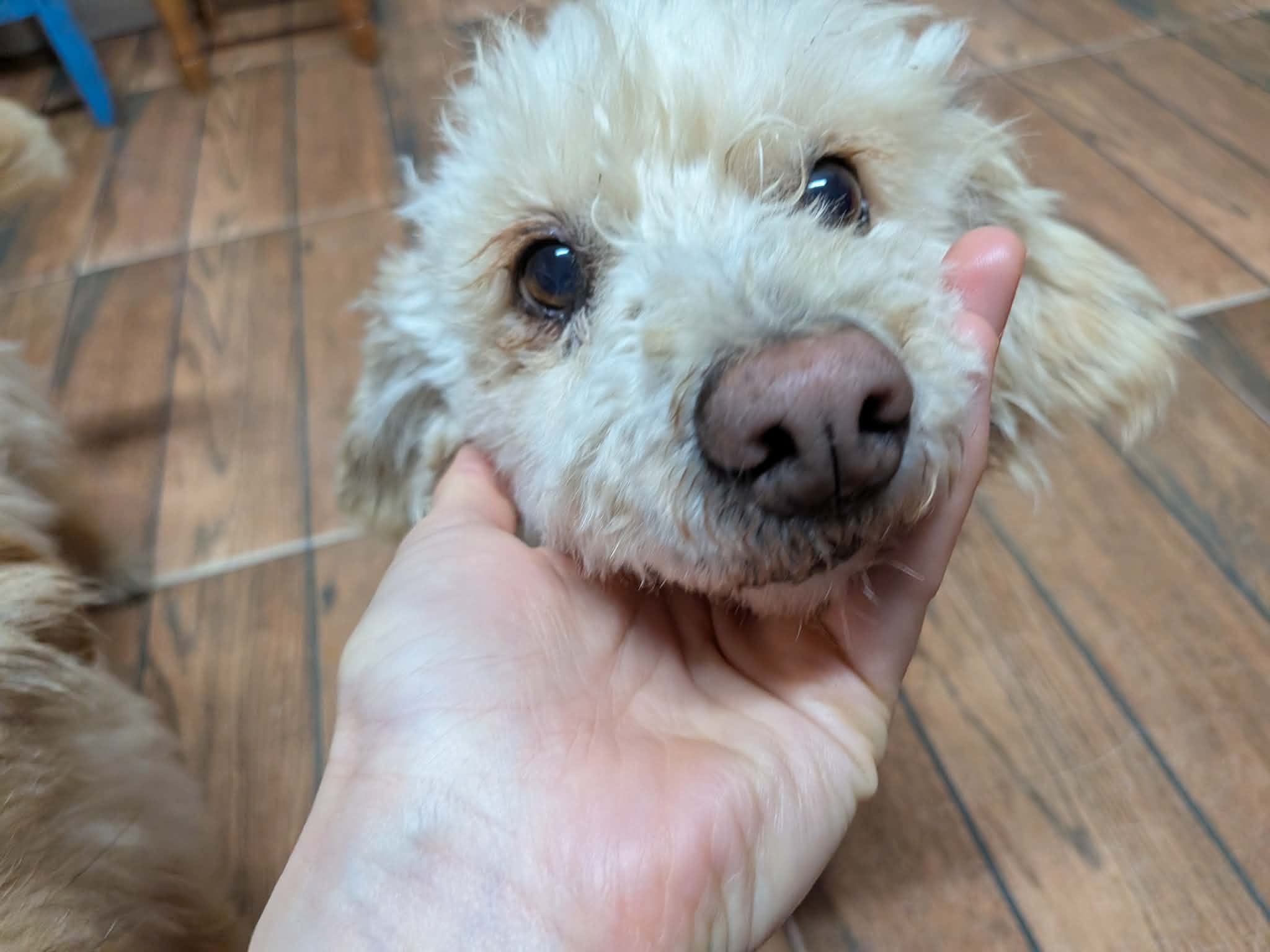 Thalia a été trouvée seule dans un champ. Son poil était très long, sale, emmêlé et plein de débris, ce qui laisse penser qu’elle errait depuis un bon moment. Une famille roumaine l’a recueillie, lui a donné un bon bain et l’a toilettée.