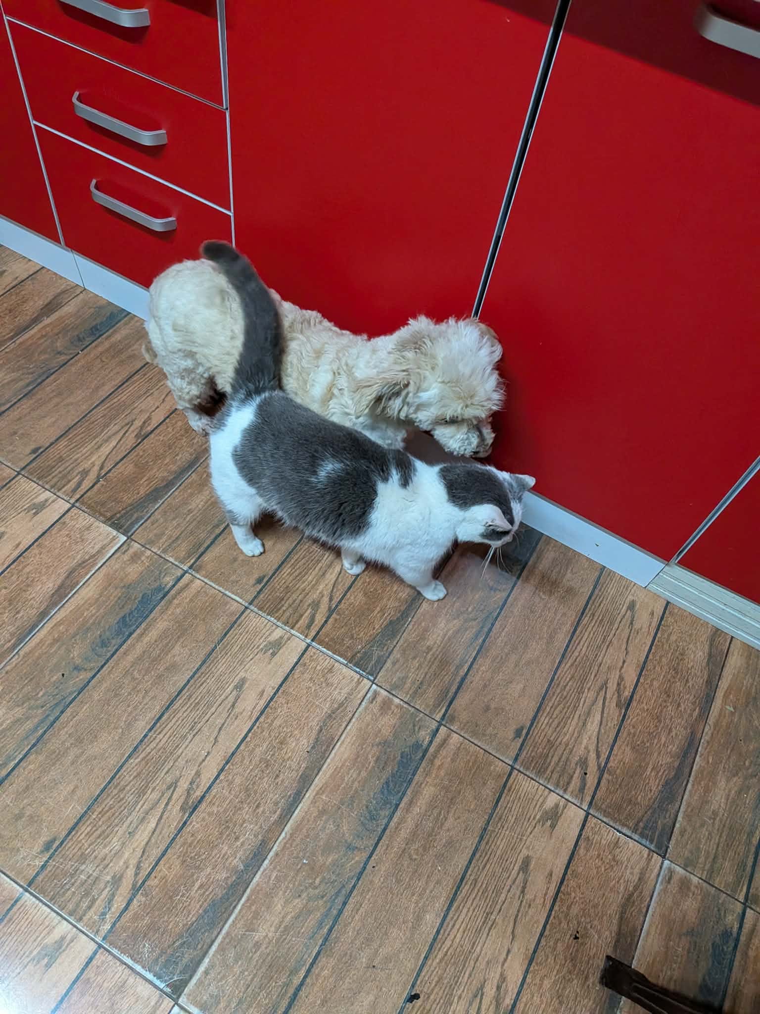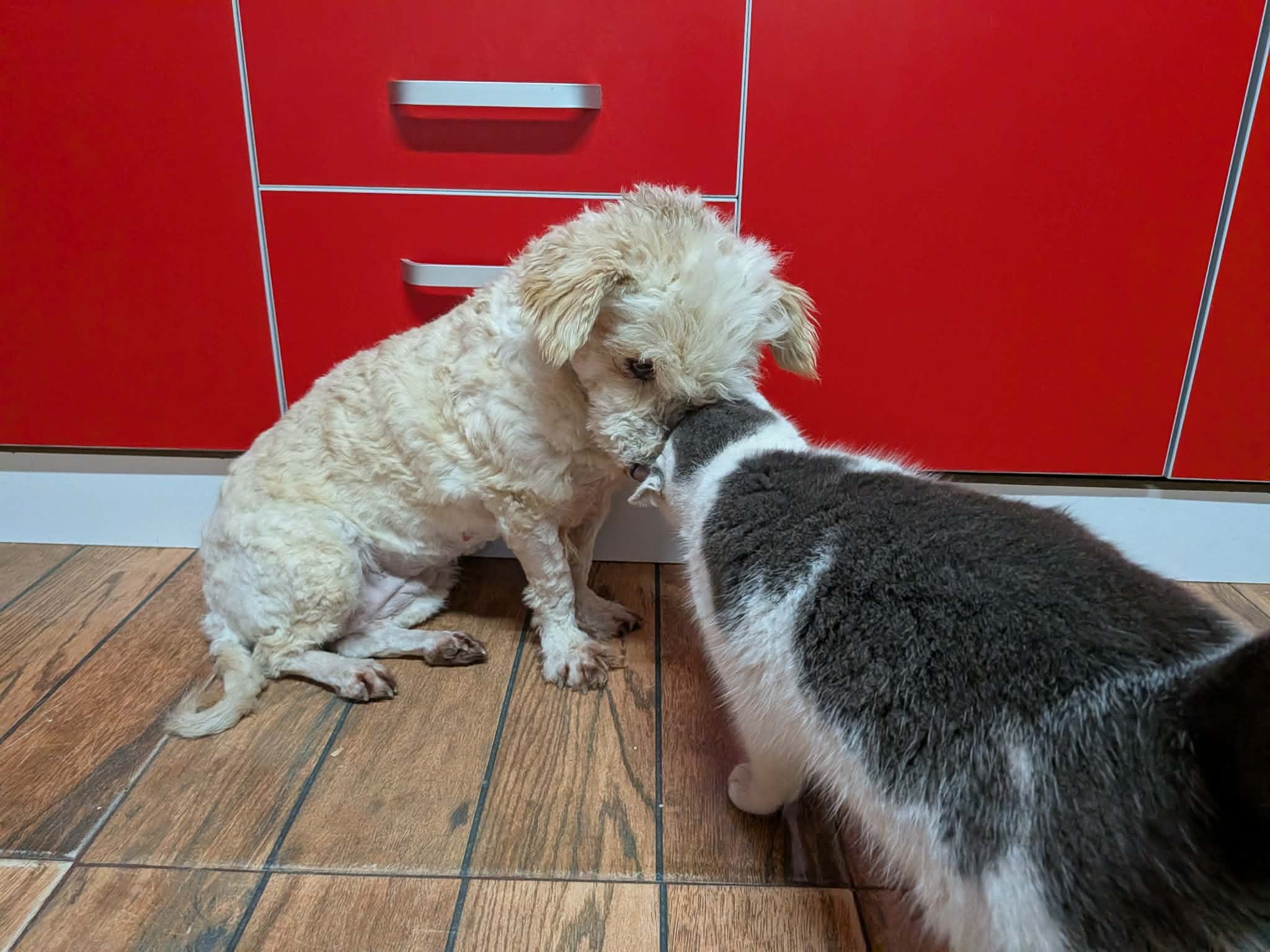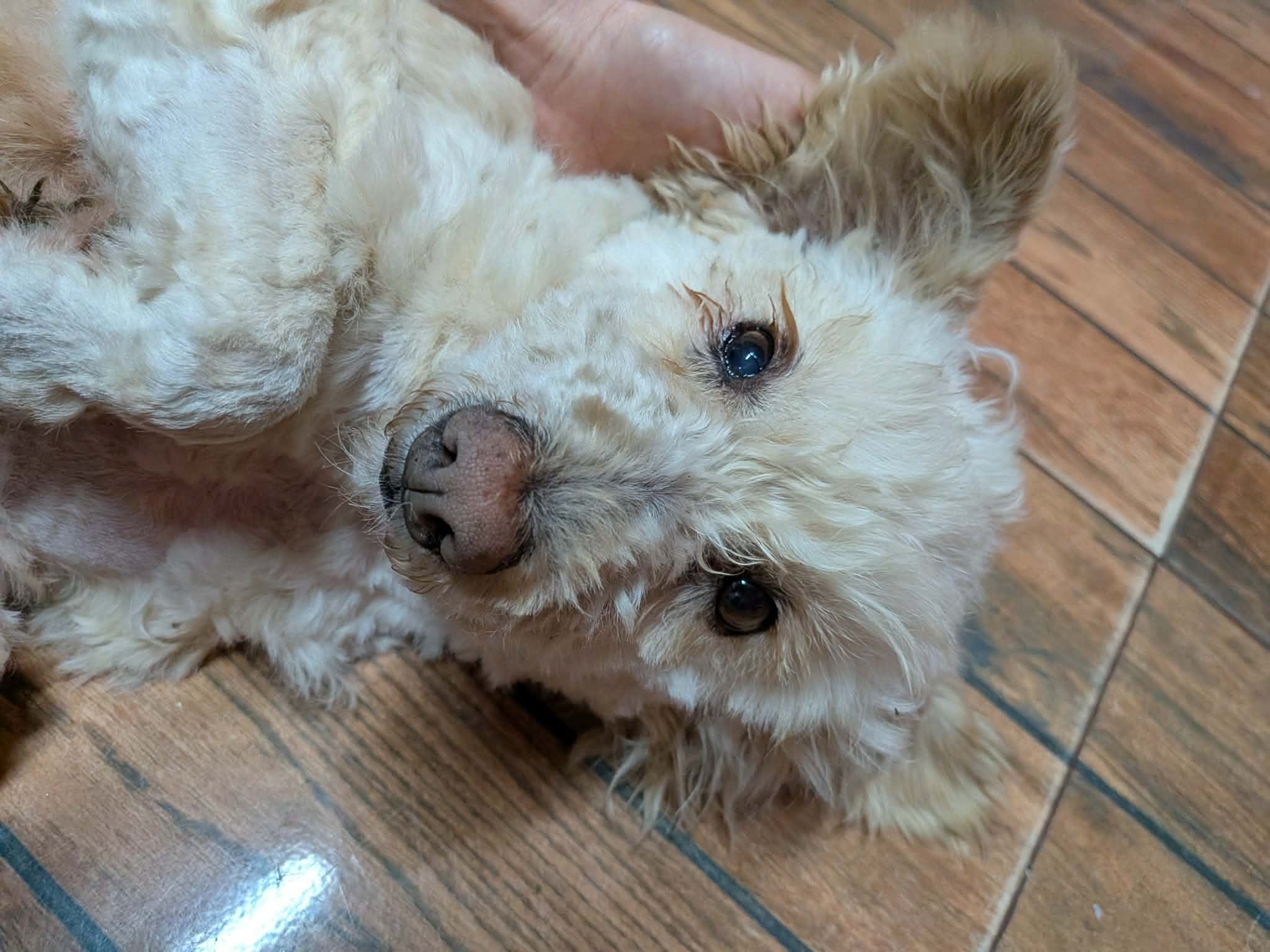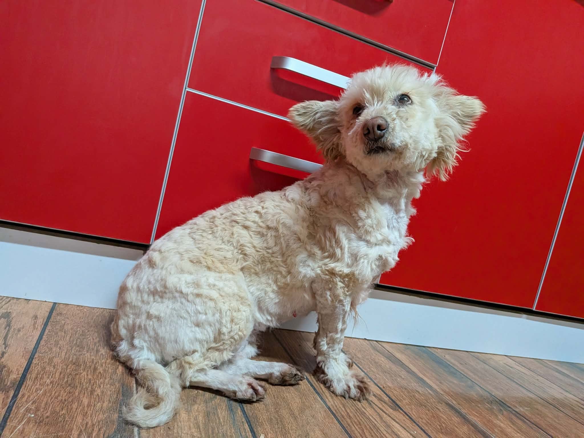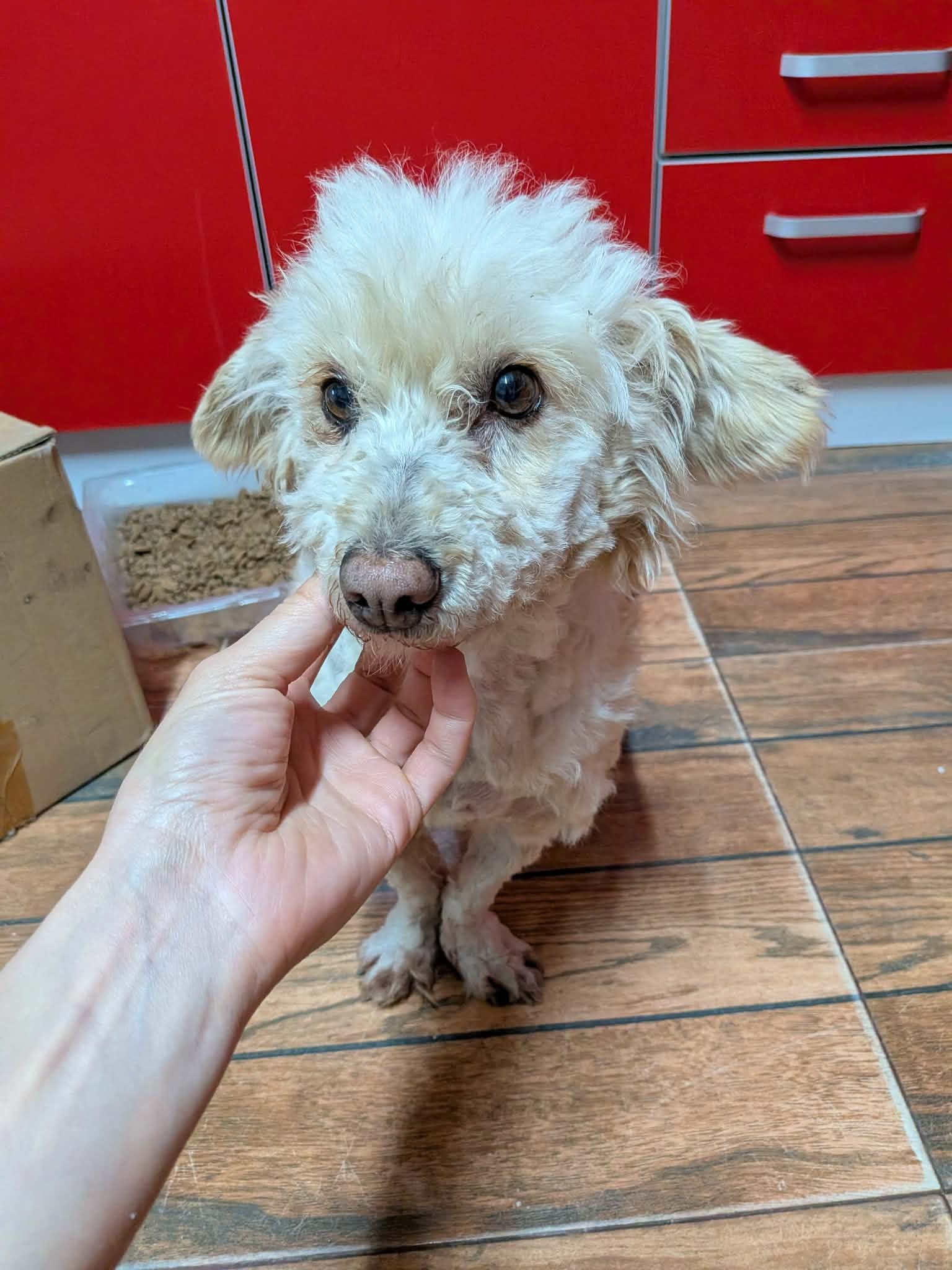 Thalia a été trouvée seule dans un champ. Son poil était très long, sale, emmêlé et plein de débris, ce qui laisse penser qu’elle errait depuis un bon moment. Une famille roumaine l’a recueillie, lui a donné un bon bain et l’a toilettée.